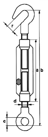 Талреп крюк-кольцо DIN 1480 открытый. Варианты с разными концевиками: крюк - кольцо (петля), кольцо - кольцо (петля - петля), крюк - крюк. Талреп используется при монтажных, строительных и других работах для изменения длины и регулировки натяжения стальных тросов, канатов, цепей, но не для подъёма грузов. Талрепы крюк-кольцо DIN 1480 изготавливаются из углеродистой стали с цинковым покрытием. Рабочие нагрузки рассчитываются вдоль оси талрепа, боковые нагрузки не допускаются. Обозначения размеров талрепов - размер резьбы х длина тела, например М6х85, M16x190.