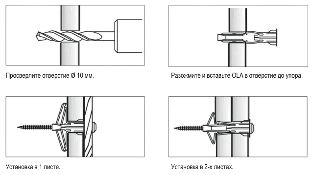 Дюбель - бабочка предназначен для крепления легких конструкций к листовым материалам, таким как фанера, гипсокартон, асбест, ацеид, ДСП и т.п. В изначальном виде, дюбель - бабочка находится в сложенном состоянии и разворачивается (как крылья бабочки) при вворачивании в него шурупа или самореза. Длина самореза (а следовательно и расстояние от листа материала до следующей конструкции) должна быть от 55 мм, чтобы саморез имел возможность раскрыть дюбель.