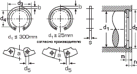 DIN 472 Кольцо стопорное внутреннее для отверстия, пружинное упорное эксцентрическое. Диаметр отверстия от 8 до 300 мм. Материалы: - Сталь пружинная - Сталь с покрытием: гальваническая оцинковка - Нержавеющая сталь: 1.4034, 1.4122, 1.4310, 1.4568 Таблица размеров внутренних стопорных колец DIN 472 для отверстий (нормальный тип) в мм