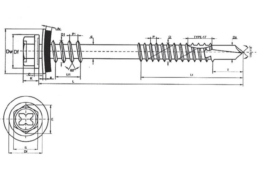 Головка самореза для сэндвич - панелей имеет шестигранную форму под ключ. Изделие укомплектовано шайбой и резиновой прокладкой из EDPM, диаметр шайбы –19 мм, прокладка предназначена для обеспечения гидроизоляции крепежа. Саморез оснащен сверловым наконечником. Особенность изделия: саморез для сэндвич - панелей имеет 2 разные резьбы, под головкой диаметр резьбы составляет 6,3мм, диаметр основной резьбы – 5,5мм.