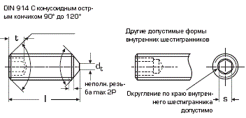 DIN 914 Винт установочный стопорный с внутренним шестигранником и коническим концом. Конец установочного винта имеет специальную коническую форму, служащую для фиксации изделий относительно друг друга.